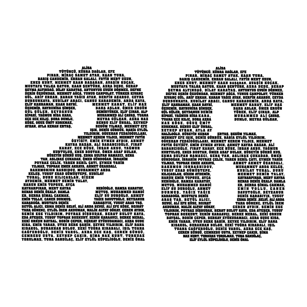 Bu çalışma, çok sayıda ismin bir araya getirilmesiyle oluşturulmuş tipografik bir tasarımdır. İsimler özel olarak düzenlenmiş ve estetik bir kompozisyon halinde yerleştirilmiştir.